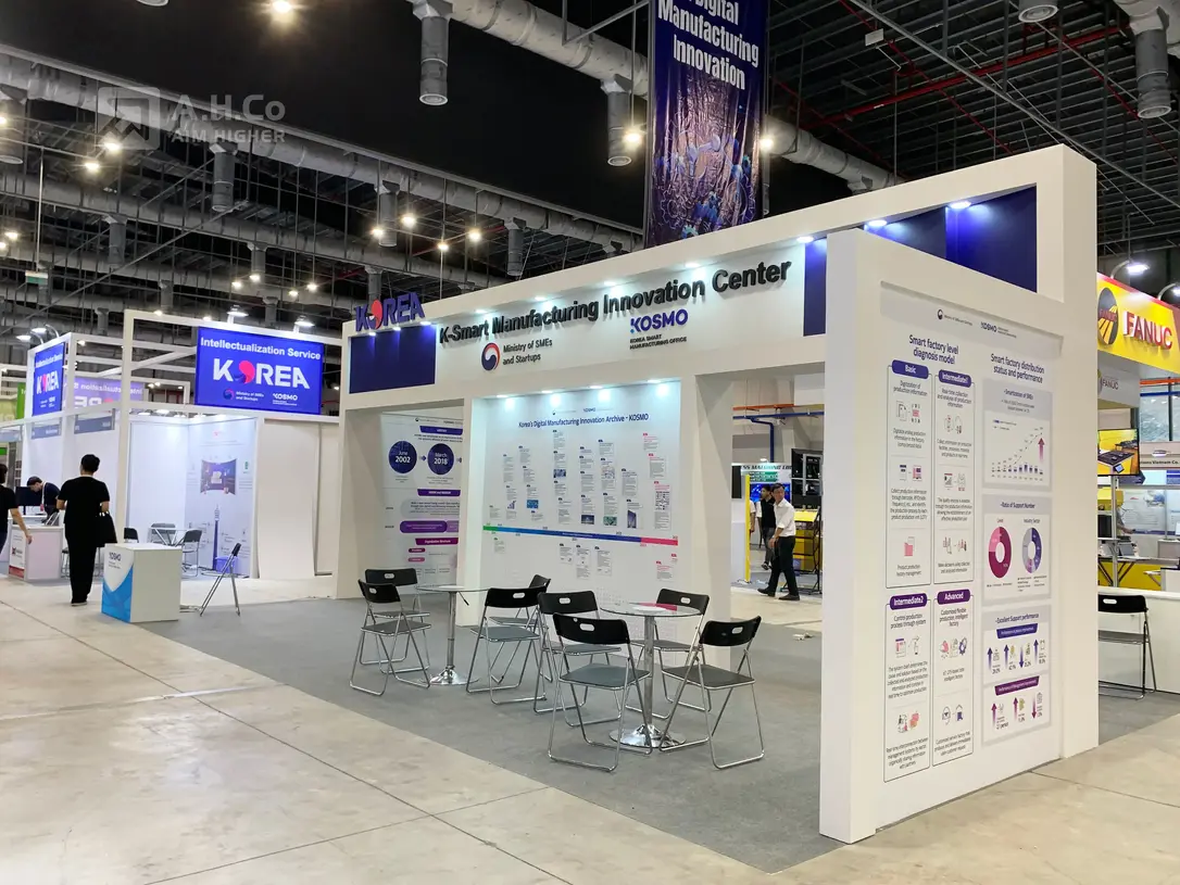 At AW, COEX Seoul, A.H.Co delivered design and build services for multiple exhibition booths, including VSIP, K-Smart MIC, LTP, and Daekhon Vina. Consistent brand systems, modern structures, light boxes, and clear information graphics helped each stand stand out in the hall.