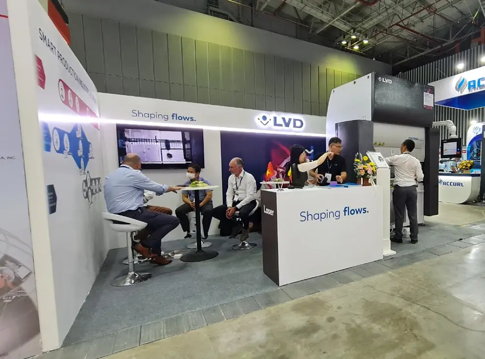 For MTA Vietnam, A.H.Co crafted a compact, production-floor style stand for LVD: overhead branding for long-range visibility, fenced automation demos for safety, and a clean briefing zone for specs. The result was a trade show booth that made complex sheet-metal workflows easy to grasp and easy to shortlist.